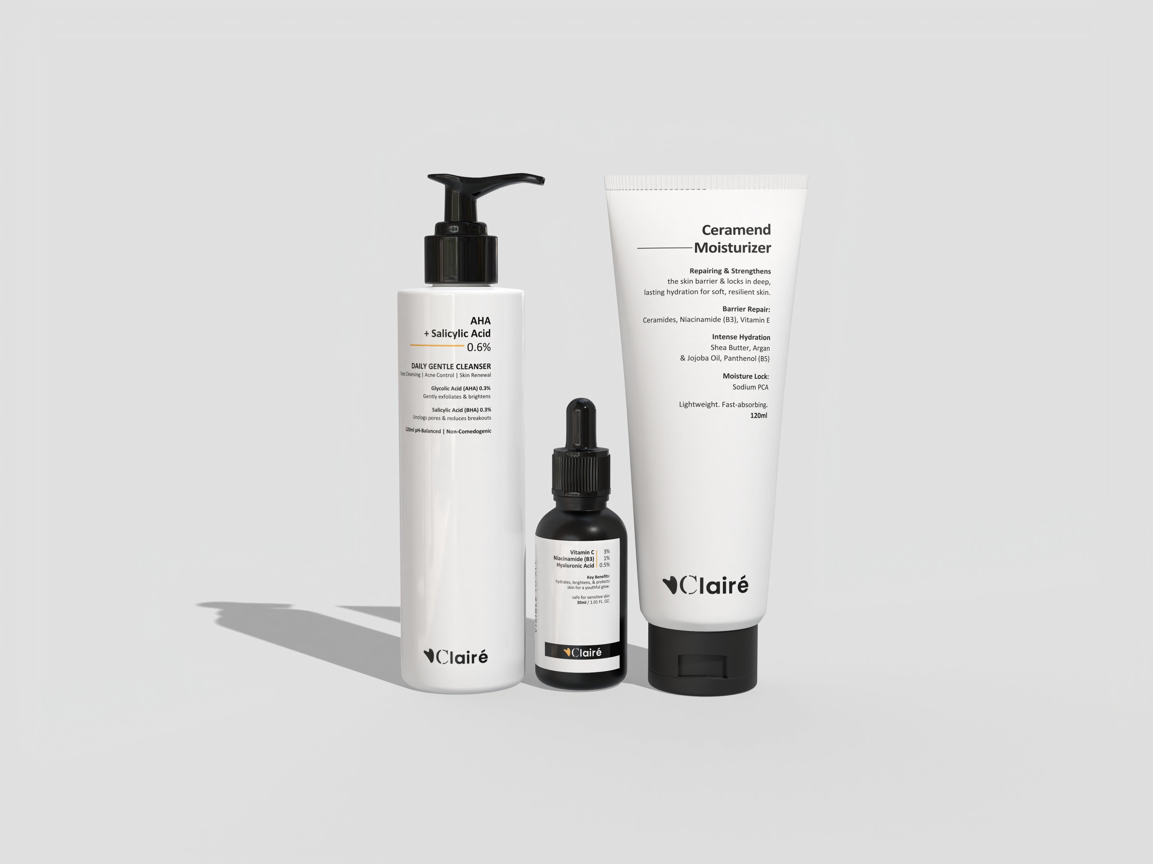 Your complete daily ritual — cleanse, hydrate, and glow. The Clairé Pack of 3 brings together the Clarifying Cleanser, Radiance Serum, and Ceramend Moisturizer for healthy, balanced, radiant skin.